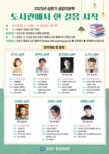 20일 유성구에 따르면 4월 도서관의 날, 도서관 주간 등을 맞아 7개 공공도서관에서 ‘도서관에서 한 걸음 시작’을 주제로 2025년 상반기 공감인문학 강연을 운영한다.