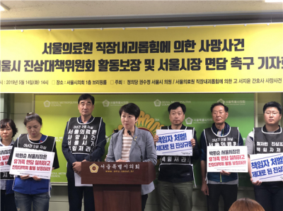 권 의원은 사망 5개월이 지나도록 사망 사건의 원인이 밝혀지지 않고 있는 현황에 대해 규탄하며 서울의료원 부서장등 관리자가 진상대책위 활동을 방해한 정황이 있는 점을 들어 서울시가 나서 제대로 된 진상조사가 이루어질 수 있도록 나서야한다고 촉구했다.