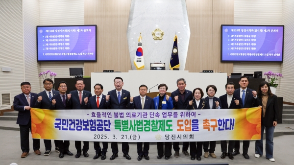 [충청뉴스큐] 당진시의회는 제118회 임시회 제2차 본회의에서 한상화 의원이 대표 발의한 국민건강보험공단에 특별사법경찰제도를 도입할 것을 촉구하는 건의안을 채택했다고 전했다.