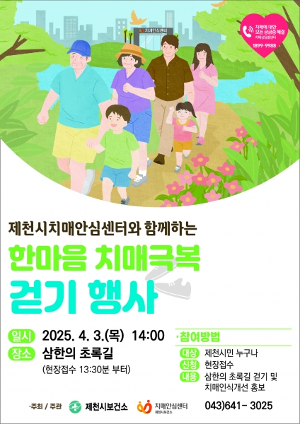 [충청뉴스큐] 제천시는 오는 4월 3일 오후 2시 삼한의 초록길 일원에서 ‘한마음 치매극복 걷기 행사’를 개최한다고 밝혔다.
