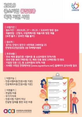 국내외 품질인증 획득 지원 대상은 공고일로부터 11월말까지 인증 획득이 완료 가능한 관내 중소·벤처기업으로 지원내용은 국내인증, 해외인증으로 기업 당 인증 1건에 한해, 인증 시험 및 획득에 소요되는 총비용의 50%를 지원한다.
