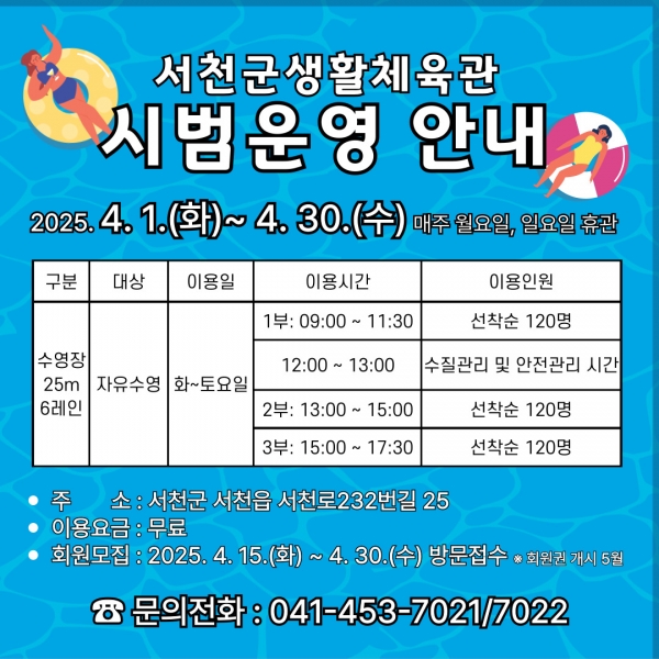 서천읍 서천로232번길 25에 자리한 서천군생활체육관은 지하 1층에서 지상 2층 규모, 연면적 3,138.24㎡로 건립됐으며 시범운영 기간에는 수영장과 헬스장 시설이 주민들에게 개방된다.