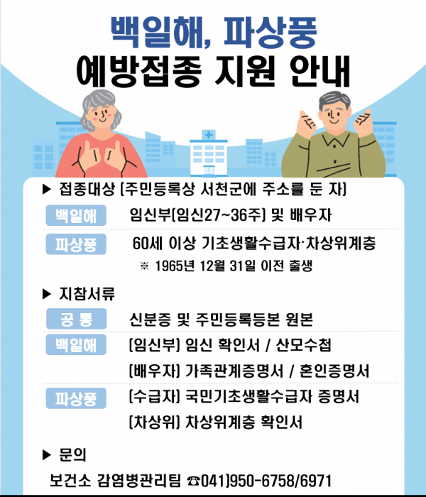 접종 대상은 서천군에 주소지를 둔 자로 백일해의 경우 임신부 및 배우자이며 파상풍은 60세 이상 기초생활수급자 및 차상위 계층이다.