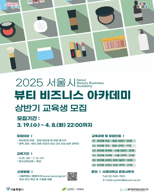 서울시는 뷰티산업의 전문인력을 양성하기 위해 운영 중인 ‘서울 뷰티 비즈니스 아카데미’ 6개 과정에 참여할 상반기 교육생 165명을 4월 8일까지 모집한다고 밝혔다.