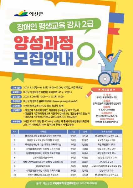 [충청뉴스큐] 예산군은 27일까지 장애인 평생교육강사 양성과정 수강생을 모집해 장애인을 위한 전문성 있는 프로그램을 제공할 강사를 양성하고 일자리 창출을 지원한다.