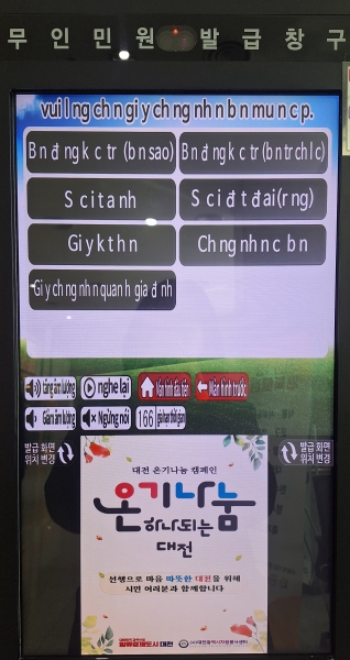 현재 서구는 대전에서 유일하게 대전 서구청·시청 무인민원발급기에 외국어 지원 서비스를 우선 시범 운영하고 있으며 다른 무인민원발급기로 점차 확대 적용할 계획이다.