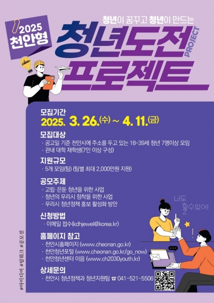 ‘2025년 천안형 청년 도전 프로젝트’는 청년이 직접 기획한 프로그램을 공모·선정해 사업비를 지원하는 사업으로 팀 당 최대 2,000만원씩 5개 팀이 지원받는다.