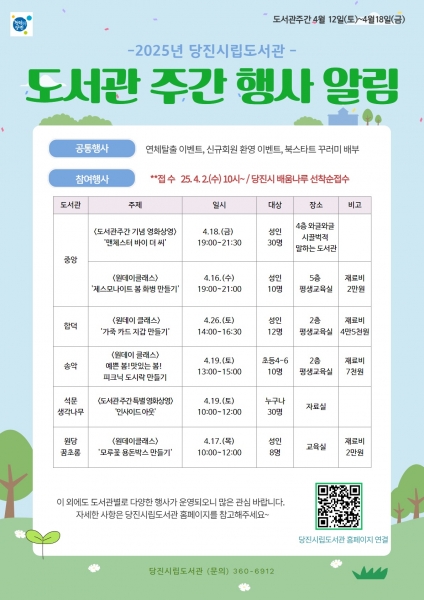접수 등 자세한 사항은 당진시립도서관 누리집을 참고하면 된다.