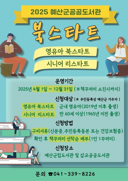 도서관 북스타트 사업은 4월 1일부터 12월 31일까지 운영되며 예산군립도서관과 삽교공공도서관에서 신청할 수 있고 별도 예약 없이 현장에서 신청서 작성 및 구비 서류를 확인 후 소진 시까지 책 꾸러미를 선착순 제공한다.