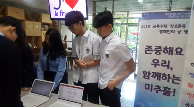미추홀외국어고등학교에서는 ‘존중해요 우리, 함께 하는 미추홀’을 주제로 학급전시회, 지금은 말할 수 있어요, 서로의 문화를 이해해요, 선생님을 찾아라 등 다채로운 행사가 진행되어 교사와 학생들의 마음을 훈훈하게 했다.