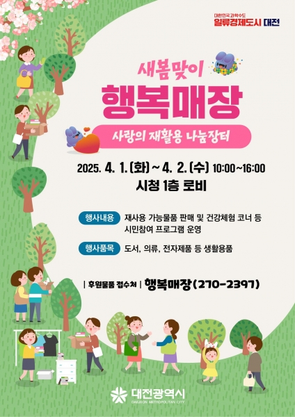 [충청뉴스큐] 대전시는 따뜻한 봄을 맞아 시민과 함께 자원의 소중함과 나눔의 가치를 되새기기 위한 ‘새봄맞이 행복매장 사랑의 재활용 나눔장터’를 개최한다.