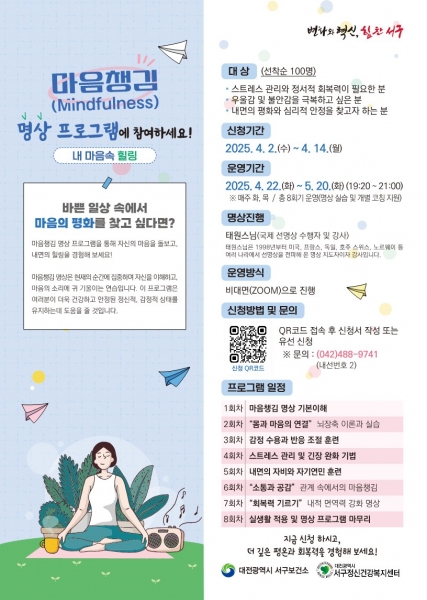[충청뉴스큐] 대전 서구는 구민들의 스트레스 관리와 내면 힐링을 돕기 위해 마음 챙김 명상 프로그램 신청을 받는다고 이달 31일 밝혔다.