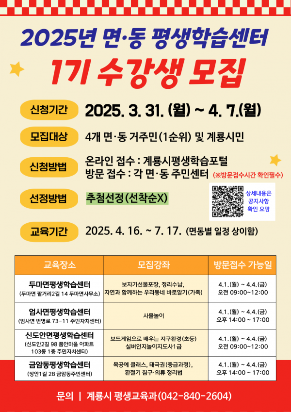 2025년 면·동 평생학습센터 수강생 모집 관련 자세한 내용은 계룡시 평생학습포털에서 확인할 수 있다.