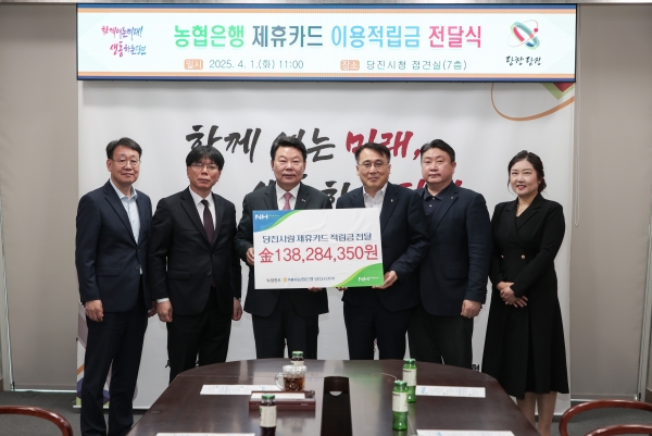 [충청뉴스큐] 당진시는 4월 1일 당진시청 접견실에서 시 금고인 NH농협은행 당진시지부로부터 제휴카드 이용 적립금 1억 3,828만 4,350원을 전달받았다고 2일 밝혔다.