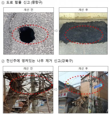 중랑구 거주 이00님의 안전신문고를 통한 신고 사례의 경우, 신내지하차도 위 동쪽 도로 함몰이 발생해 보행시 시민들의 부상의 위험이 있었으나 신고 후 처리담당부서의 현장 확인후 이틀만에 보수완료해 위험요인이 제거되었으며, 강북구 거주 김00님의 120다산콜센터를 통한 신고 사례의 경우, 도로변의 전신주에 엉켜있는 나뭇가지들로 인한 안전 위험요인을 발견해 신고함으로써 인명 및 재산 피해 우려가 있는 위험한 수목 제거 조치가 처리담당부서를 통해 신고 다음날 바로 처리됐다.
