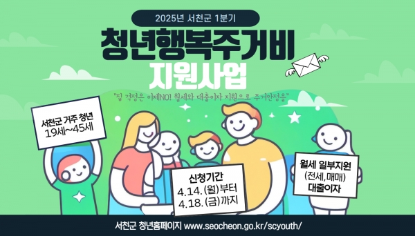 [충청뉴스큐] 서천군이 오는 14일부터 18일까지 2025년 1분기 청년 행복 주거비 지원 신청을 받는다.