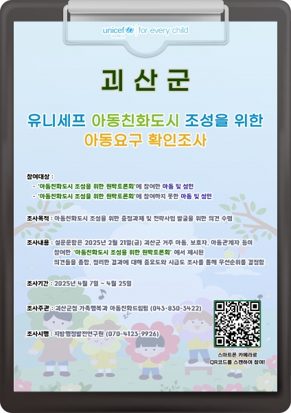 [충청뉴스큐] 충북 괴산군은 오는 25일까지 관내아동과 보호자, 아동관계자를 대상으로 오는 25일까지 ‘아동요구 확인조사’를 실시한다고 밝혔다.