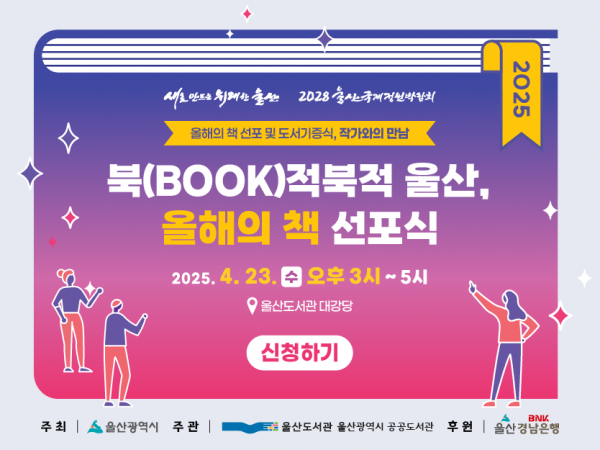 [충청뉴스큐] 울산도서관은 오는 4월 23일 오후 3시 울산도서관 1층 대강당에서 개최하는 ‘2025년 북적북적 울산, 올해의 책 선포식’ 참가자를 모집한다고 밝혔다.