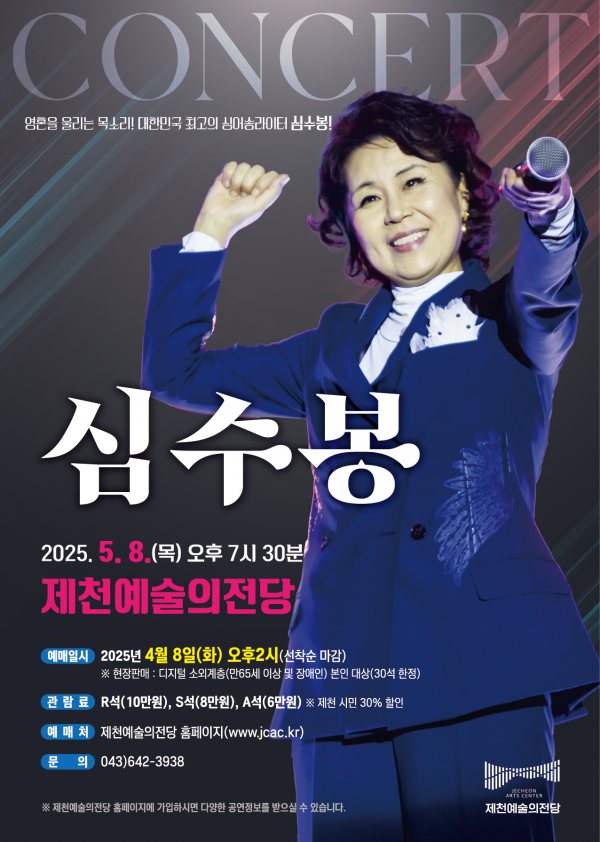 [충청뉴스큐] 오는 5월 8일 오후 7시 30분, 대한민국의 국민 가수 심수봉이 어버이날을 맞아 제천예술의전당 대공연장에서 단독 콘서트를 개최한다.