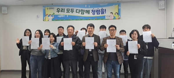 이날 환경보전과는 부서 전 직원이 참여해 부정청탁 및 금품수수금지 서약과 깨끗한 공직윤리관 확립, 올바른 조직문화 형성을 위한 의지를 다지는 시간을 가졌다.