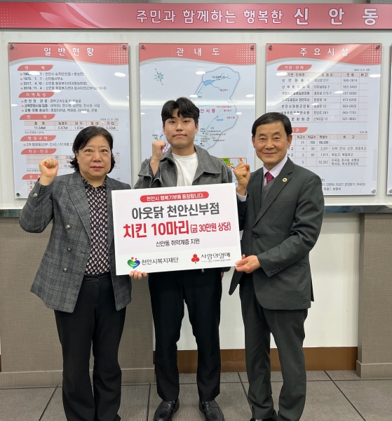 [충청뉴스큐] 천안시 신안동은 지난 9일 아웃닭 천안신부점이 치킨 10마리를 기탁했다고 밝혔다.