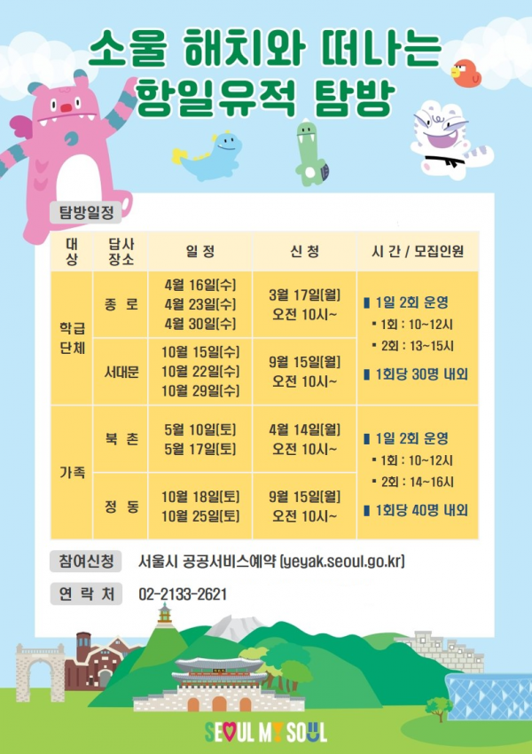 4월부터 초등학생과 가족을 대상으로 ‘항일독립운동 유적 답사’를 시작하고 서울역사편찬원은 초등학생 동반가족과 외국인 유학생을 대상으로 서대문 일대를 답사하는 ‘서울의 독립운동 문화유산 답사’ 프로그램을 운영하고 서대문독립공원, 종로 명동, 효창공원 등은 ‘답사 영상’을 제작해 배포한다.