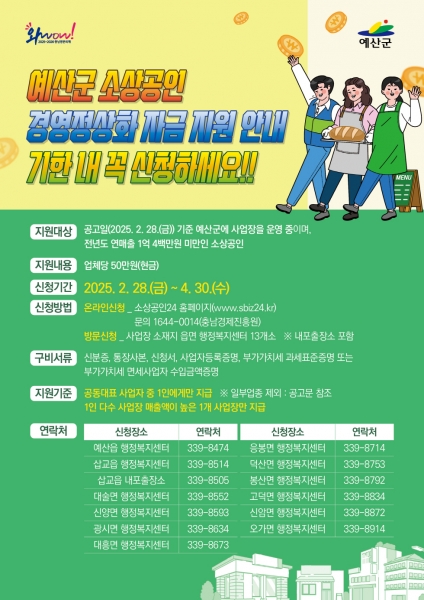 [충청뉴스큐] 예산군은 경기침체 등에 따른 소상공인 경영안정과 지역경제 활성화를 도모하기 위해 소상공인 경영정상화 자금 지원 신청기간을 4월 30일까지 연장한다고 밝혔다.