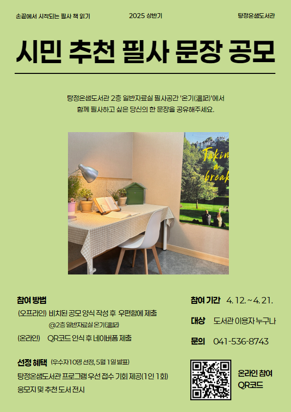 선정된 문장이 담긴 도서는 필사 공간에 비치되며 선정자에게는 탕정온샘도서관 프로그램 우선 접수 기회를 제공한다.