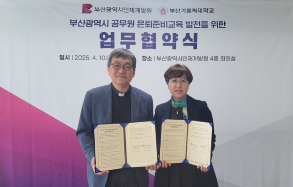 이번 협약은 공무원들의 은퇴 후 삶에 대한 체계적인 준비를 지원하기 위해 마련됐으며 김은희 시 인재개발원장, 홍경완 부산가톨릭대학교 총장 등이 참석했다.