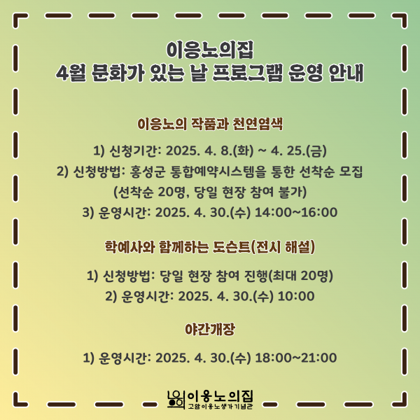 김태기 문화관광과장은 “이응노 선생의 예술세계를 다양한 감각으로 체험할 수 있는 이번 프로그램이, 지역민과 방문객 모두에게 의미 있는 시간이 되길 바란다”며 “앞으로도 매달 문화가 있는 날을 통해 새로운 문화 향유 기회를 지속적으로 제공할 계획”이라고 밝혔다.
