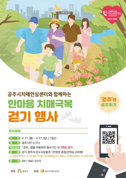 걷기 목표를 달성한 시민 중 선착순 200명에게는 온누리상품권 1만원권이 제공될 예정으로 상품은 4월 28일 공주시 치매안심센터를 방문해 직접 수령하면 된다.