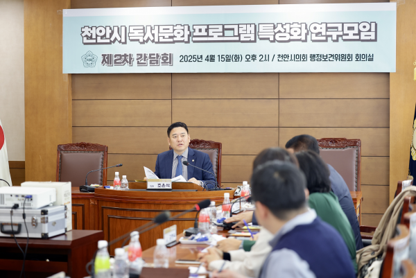 [충청뉴스큐] 천안시의회는 ‘천안시 독서문화 프로그램 특성화 연구모임’ 이 4월 15일 제2차 간담회 및 착수보고회를 열고 동참의원들과 연구방향 등을 논의했다고 밝혔다.