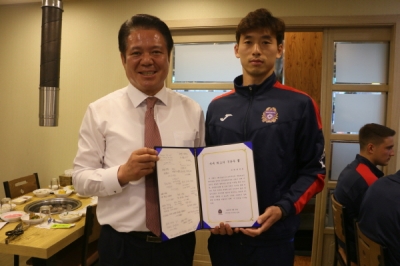 FC안양 선수단은 이 자리에서 최대호 구단주에게 ‘세계 최고의 구단주 상’을 수여했다. 지속적인 관심과 열정으로 구단을 지원하고, 안양시 축구 인프라 구축에 크게 기여한 최대호 구단주에게 감사함을 전달하기 위한 작은 이벤트였다. 주장 주현재가 선수단을 대표해 전달했다.