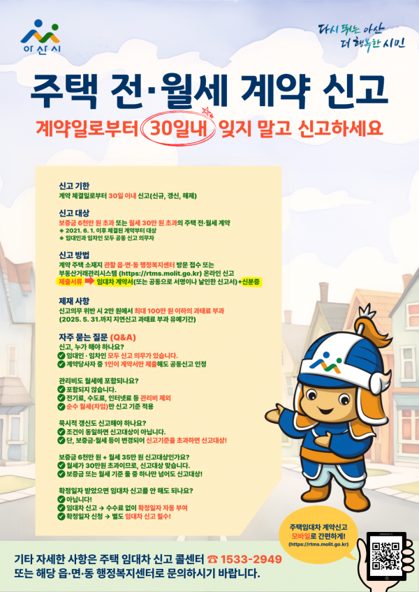 [충청뉴스큐] 아산시가 ‘주택 임대차 신고제’ 과태료 부과 유예기간이 오는 5월 31일 종료됨에 따라, 신고 대상자는 유예기간 내 반드시 신고해 줄 것을 당부했다.