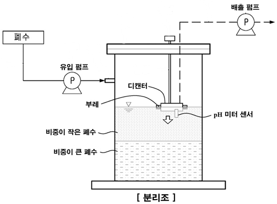 전체 처리 공정은 비중 차로 인해 폐수가 상하로 층 분리되면 디캔터로 상층의 비중이 상대적으로 작은 1차 처리수를 먼저 분리한 후, 하층의 비중이 큰 2차 처리수의 pH를 측정해 실시간으로 산성 폐수와 염기성 폐수로 각각 분리해 저장한다.