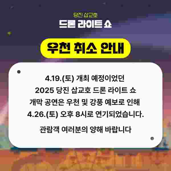 [충청뉴스큐] 당진시는 당초 4월 19일 삽교호 바다공원에서 진행할 예정이었던 ‘2025 당진 삽교호 드론 라이트 쇼’ 개막식을 우천 등 기상악화로 취소했다고 18일 밝혔다.