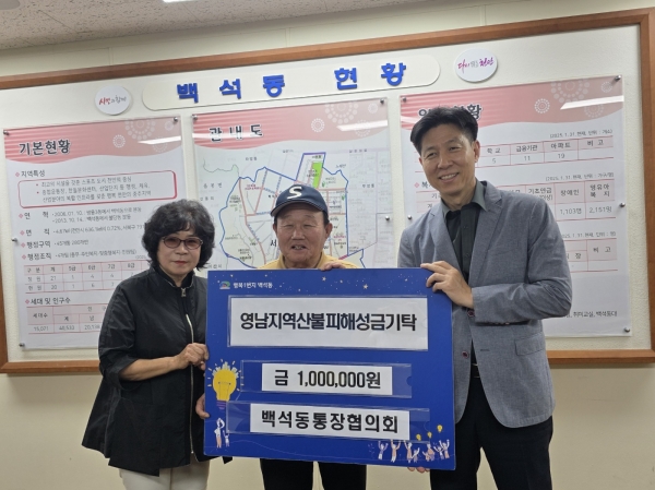 [충청뉴스큐] 천안시 백석동은 지난 17일 통장협의회가 영남지역 산불피해 이재민을 위한 성금 100만원을 기탁했다고 밝혔다.