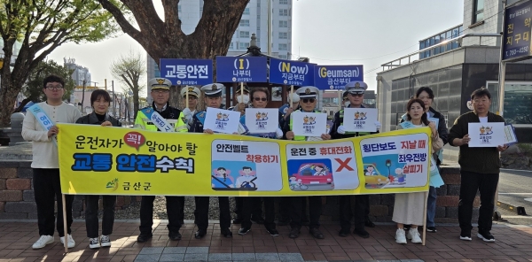 이번 캠페인은 금산경찰서 모범운전자회와 합동으로 추진했으며 운전자가 꼭 알아야 할 교통안전 수칙인 전 좌석 안전벨트 착용, 운전 중 휴대전화 사용 금지, 보행자 신호 시 일시 정지 등에 동참해 줄 것을 당부했다.