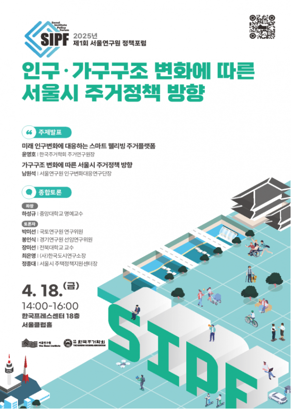 [충청뉴스큐] 서울연구원과 한국주거학회는 4월 18일 오후 2시, 한국프레스센터 서울클럽홀에서 ‘인구·가구구조 변화에 따른 서울시 주거정책 방향’을 주제로 ‘2025년 제1회 서울연구원 정책포럼’을 공동 개최한다.