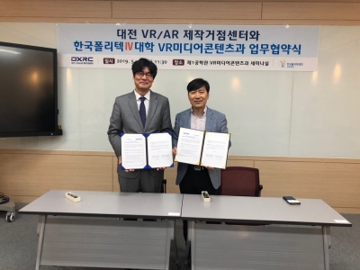 [충청뉴스큐] 대전정보문화산업진흥원 대전VR/AR제작거점센터는 17일 오전 11시 한국폴리텍대학 대전캠퍼스 대회의실에서 가상현실 분야 지역기업 육성 및 우수 인재양성을 위해 한국폴리텍대학 대전캠퍼스 VR미디어콘텐츠과와 업무협약을 체결했다.