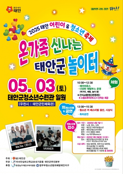 군은 오는 5월 3일 오전 10시부터 태안군청소년수련관 일원에서 ‘온 가족 신나는 태안군 놀이터, 2025년 어린이&청소년 축제’ 가 개최된다고 밝히고 군민들의 많은 관심과 참여를 당부했다.