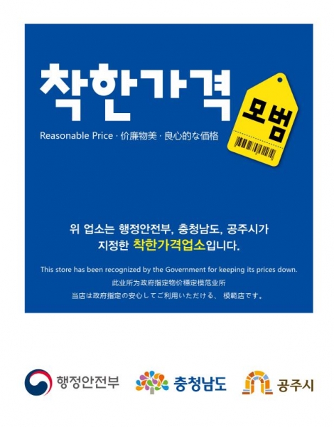 [충청뉴스큐] 공주시는 저렴한 가격으로 지역 물가 안정에 기여하고 있는 ‘착한가격업소’를 오는 4월 30일까지 공개 모집한다고 밝혔다.