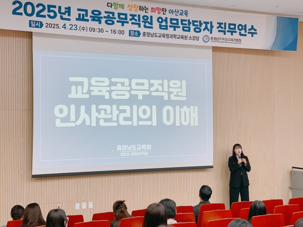 [충청뉴스큐] 아산교육지원청은 4월 23일 충청남도교육청과학교육원 2층 소강당에서 관내 교육공무직 인사 및 급여 업무담당자를 대상으로 “2025년 교육공무직원 업무담당자 직무 연수”를 실시했다.