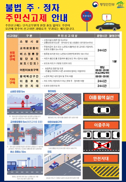 주요내용으로는 24시간 주민신고가 가능했던 노란색 이중선 구간의 신고 가능 시간이 ‘08시부터 20시까지’로 조정됐으며 이중주차 및 도로 내 안전지대 주·정차는 기존과 동일하게 24시간 신고할 수 있다.