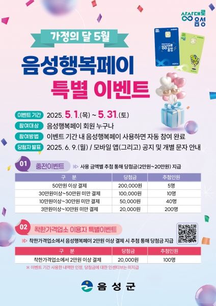 [충청뉴스큐] 음성군은 가정의 달 5월을 맞이해 음성행복페이 구매한도를 70만원으로 상향하고 충전이벤트와 착한가격업소 이용자 특별이벤트를 추진한다.