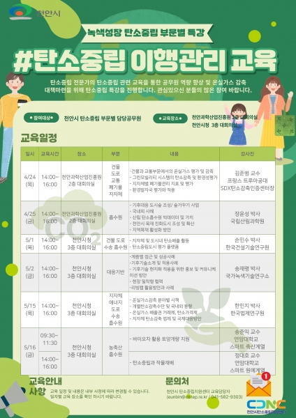 [충청뉴스큐] 천안시 탄소중립지원센터는 오는 5월 16일까지 공무원을 대상으로 녹색성장 탄소중립 이행관리 교육을 진행한다고 29일 밝혔다.