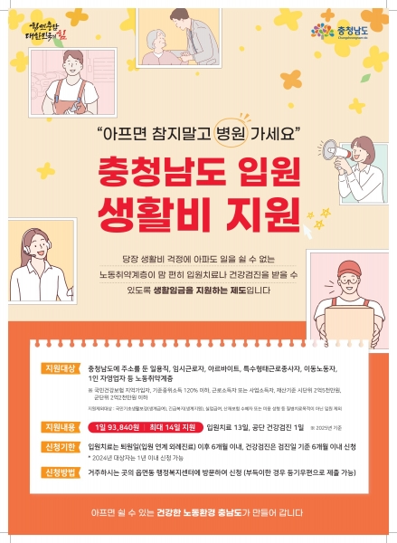 ‘충남형 입원생활비 지원’은 생활비 걱정으로 병원 방문이 어려운 노동취약계층이 입원치료나 건강검진을 안심하고 받을 수 있도록 생계비를 일정 기간 지원하는 제도로 2023년 1월부터 시행되고 있다.