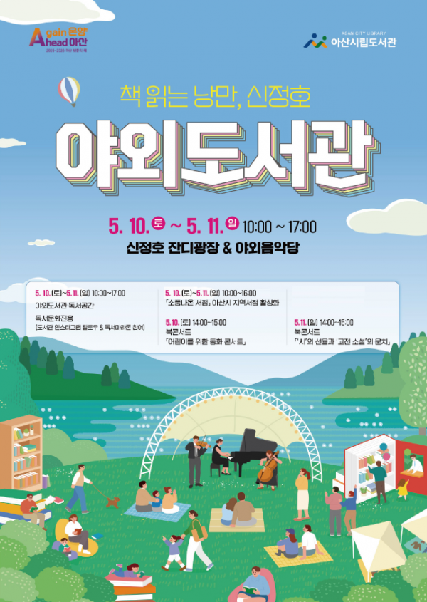 [충청뉴스큐] 아산시가 ‘2025~2026 충남 아산 방문의 해’를 맞아, 오는 5월 10일 토요일부터 5월 11일 일요일까지 신정호에서 ‘책 읽는 낭만, 신정호 야외도서관’을 운영한다.