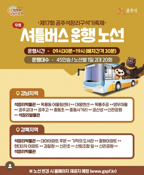 [충청뉴스큐] 공주시는 오는 5월 3일부터 6일까지 나흘간 열리는 ‘제17회 공주 석장리 구석기축제’ 기간 동안 관람객의 편리한 행사장 접근을 돕기 위해 무료 셔틀버스를 운행한다고 밝혔다.