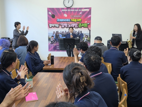 ㈜훼미리푸드 정철재 대표는 “해마다 이맘때 봄나들이 야유회를 다녀왔지만 올해는 사정상 가지 못해 아쉬웠는데 이렇게 직접 찾아와 미니콘서트와 노래방을 열고 근로의욕을 붇돋아 줘 진심으로 감사드린다”고 말했다.